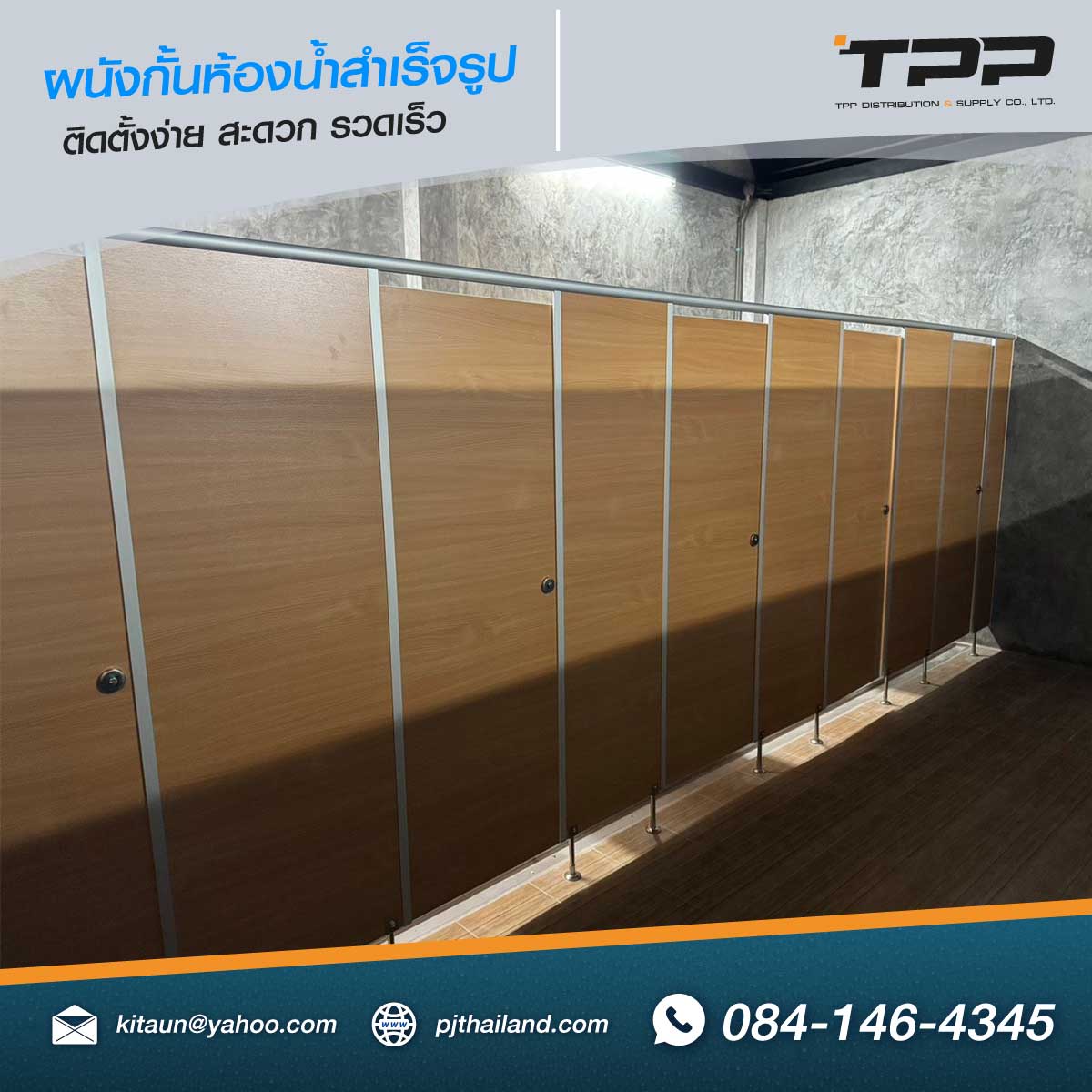 TPP ดำเนินการติดตั้งผนังกั้นห้องน้ำจำนวน 8 ห้อง พร้อมแผงกั้น 2 แผง โดยเลือกใช้วัสดุกันน้ำเต็มแผ่น รุ่น PN22