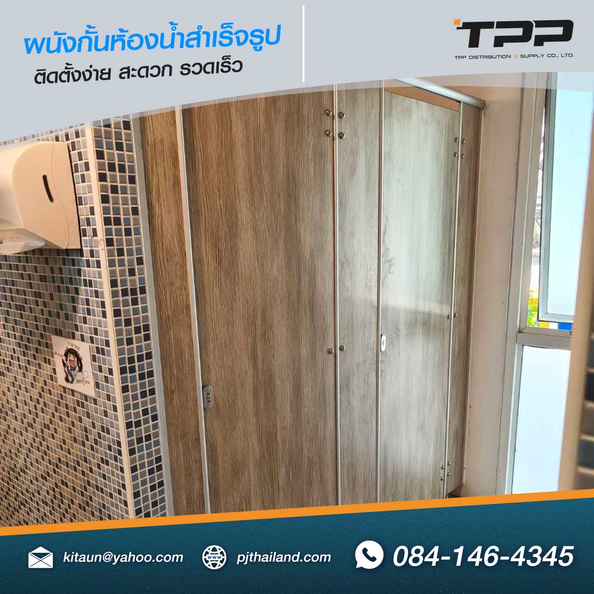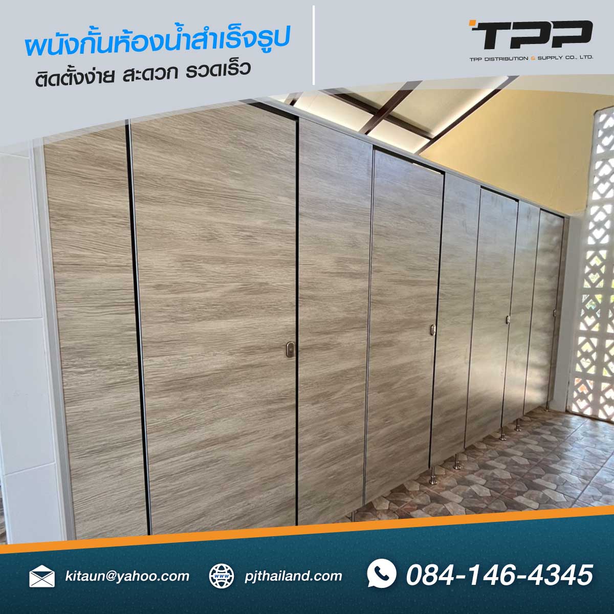TPP ดำเนินการติดตั้งผนังกั้นห้องน้ำสำเร็จรูป โดยเลือกใช้วัสดุกันน้ำลายไม้ รุ่น PN22 แนวตั้ง