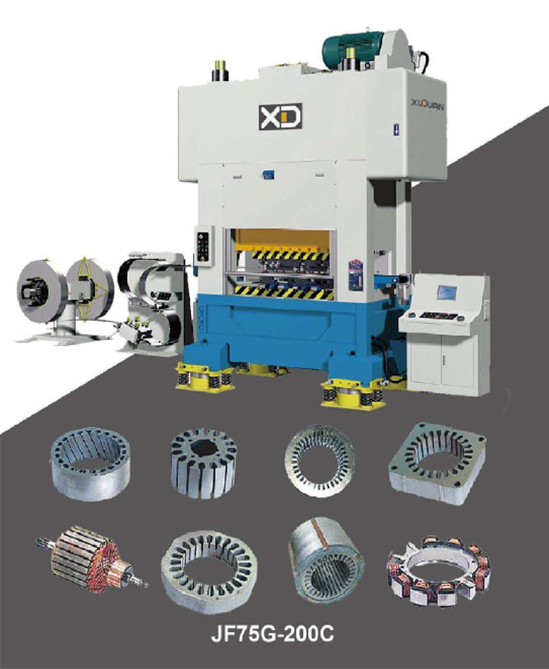 Through finite element and mode analysis and 3D CAD design, JF75G series straight high speed precision has fine construction and is suitable for manufacturing motor rotor and microelectronic etc. Fixed with auto feeder, the press will realize high efficient and precision punching.