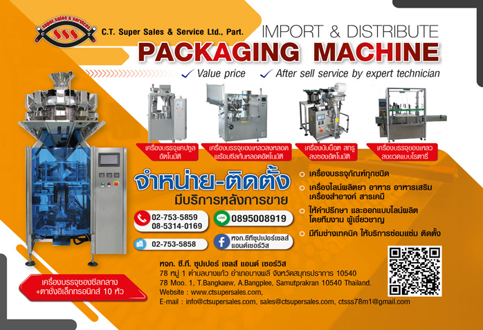ห้างหุ้นส่วนจำกัดซี.ที. ซุปเปอร์ เซลส์ แอนด์ เซอร์วิส จำหน่ายเครื่องบรรจุภัณฑ์, นำเข้าเครื่องบรรจุภัณฑ์, เครื่องบรรจุภัณฑ์ทุกชนิด, เครื่องบรรจุอัตโนมัติ, เครื่องบรรจุกึ่งอัตโนมัติ, เครื่องพิมพ์วันที่, เครื่องบรรจุสารเคมี, เครื่องบรรจุ, ไลน์ผลิตอาหาร, ไลน์ผลิตยา, เครื่องบรรจุชาสมุนไพร, เครื่องบลีสเตอร์แพค, เครื่องจักรนำเข้า, เครื่องบรรจุแคปซูล, เครื่องบรรจุแนวตั้ง, เครื่องนับเม็ดยา