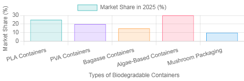แผนภูมิแสดงส่วนแบ่งการตลาดที่คาดการณ์ไว้ของภาชนะย่อยสลายได้ประเภทต่างๆ ในปี 2568 โดยเน้นถึงแนวโน้มใหม่ๆ ในโซลูชันบรรจุภัณฑ์ที่ยั่งยืน