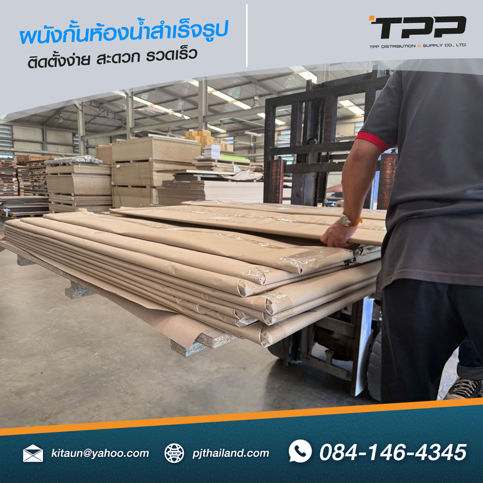 TPP ดำเนินการติดตั้งผนังกั้นห้องน้ำสำเร็จรูป วัสดุกันน้ำ รุ่น AJ9 หน้างาน ซอยวัดพันท้ายนรสิงห์ จังหวัดสมุทรสาคร ลายไม้แนวตั้งในโทนอบอุ่น