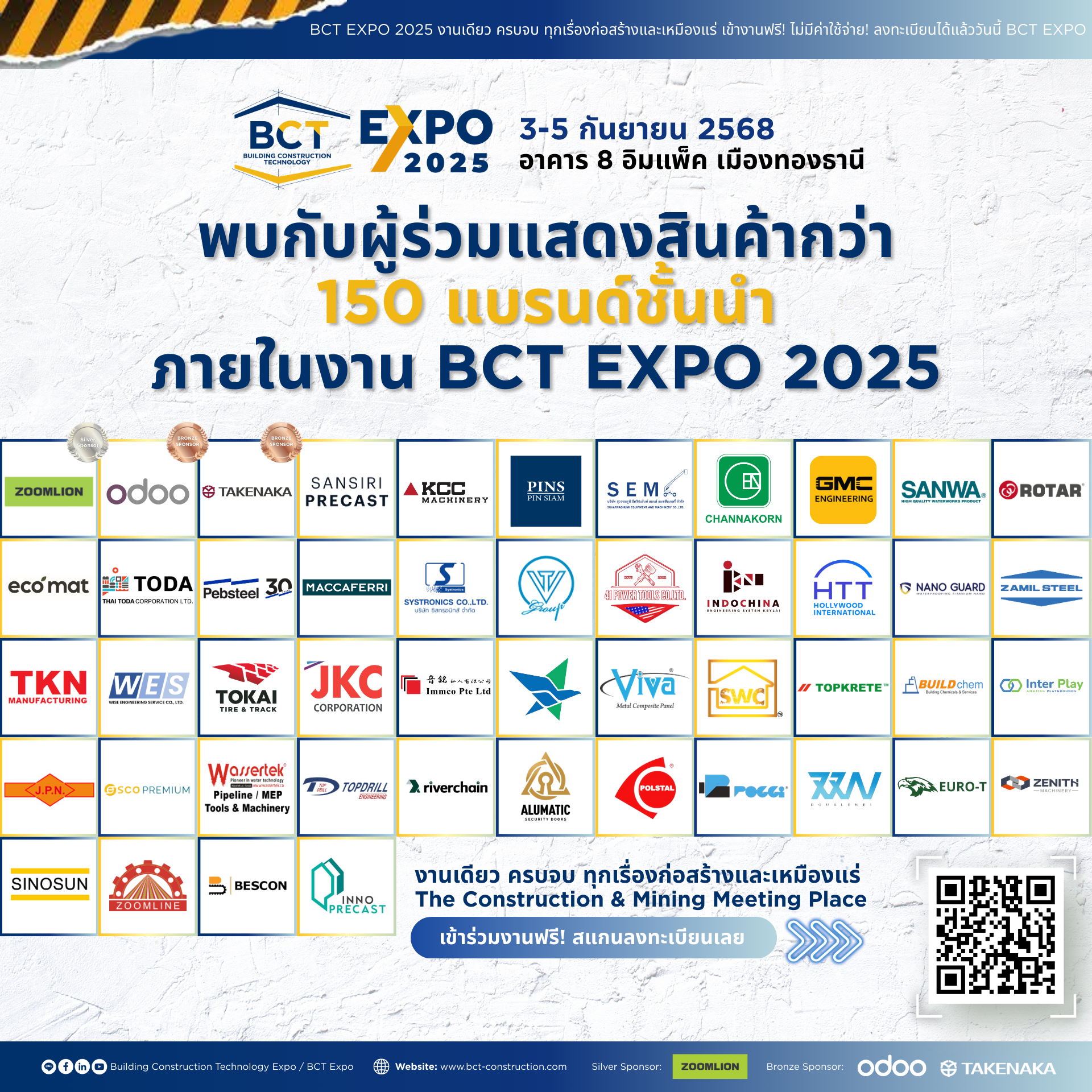 เตรียมตัวพบกับ 150 แบรนด์ชั้นนำในวงการอาคาร การก่อสร้าง และเหมืองแร่จากไทยและทั่วทุกมุมโลก ยกทัพเครื่องจักร วัสดุอุปกรณ์ เทคโนโลยี นวัตกรรม โซลูชันก่อสร้างใหม่ล่าสุดให้คุณได้ชมก่อนใคร พร้อมโปรโมชั่นสุดพิเศษ ภายในงาน BCT EXPO 2025 – งานเดียว ครบจบ ทุกเรื่องก่อสร้างและเหมืองแร่